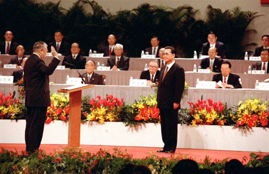 1997年7月1日凌晨,中华人民共和国香港特别行政区成立暨特区政府宣誓就职仪式在香港会议展览中心新翼七楼隆重举行。香港特区首任行政长官董建华宣誓就职,李鹏同志监誓。 新华社记者 刘建国 摄