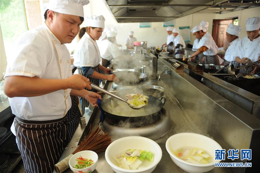 贵州省凯里市的易地扶贫搬迁群众在凯里市第一中等职业技术学校学习制作菜品(2017年5月9日摄)。新华社记者 陶亮 摄