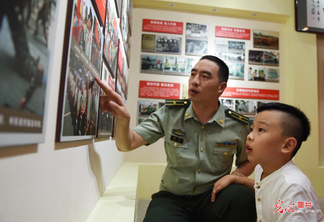 2019年7月27日,在中国人民解放军建军92周年即将到来之际,武警安徽总队合肥支队组织开展"探秘军营庆八一"主题活动,200余名军娃军属走进军营观摩军事动作演示、体验武器装备、参观荣誉室,观看文艺演出等体验军营生活。军人家庭聚少离多,他们珍惜在军营一家团聚的宝贵时光,切身感受军营的火热氛围,以别样的方式共庆"八一"建军节。图为一名小军娃在认真聆听军营爸爸讲述部队的战斗故事。(徐伟摄/光明图片)