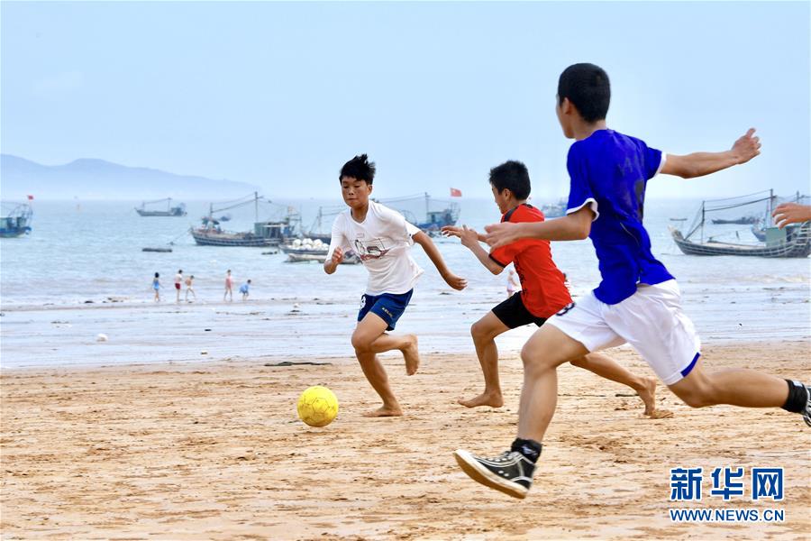 图为7月16日,福建省霞浦县下浒镇外浒沙滩上,“长风”足球队队员陈孝鸿(左)在与队友练球。 新华社记者姜克红摄