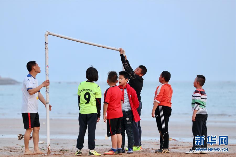 图为4月9日,福建省霞浦县下浒镇外浒沙滩上,“长风”足球队教练陈龙强(左一)带领小球员们用水管搭建简易球门。 新华社记者姜克红摄