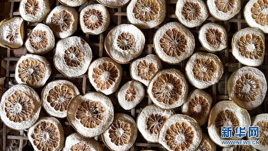 这是钦州市钦南区那丽镇芦荻竹村村民生产的中草药材橘红(7月29日摄)。 广西钦州市钦南区那丽镇芦荻竹村是扶贫村。2017年6月,芦荻竹村成立了满昌中草药种植专业合作社,带动贫困户通过基地务工、土地入股、合作分红形式发展种植橘红、金钱草和五指毛桃等特色中草药材,助推当地贫困群众脱贫增收。 新华社记者 张爱林 摄