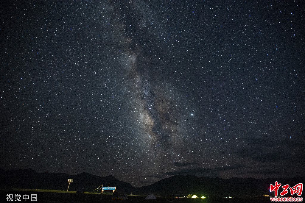 2019年7月24-28日,青海玉树,巴塘草原上空的满天星斗闪烁着光芒,像无数银珠,密密麻麻镶嵌在深黑色的夜幕上。银河像一条淡淡发光的白色光带,横跨繁星密布的天空,草原的夜色令人目酣神醉。图片作者:封疆江/视觉中国