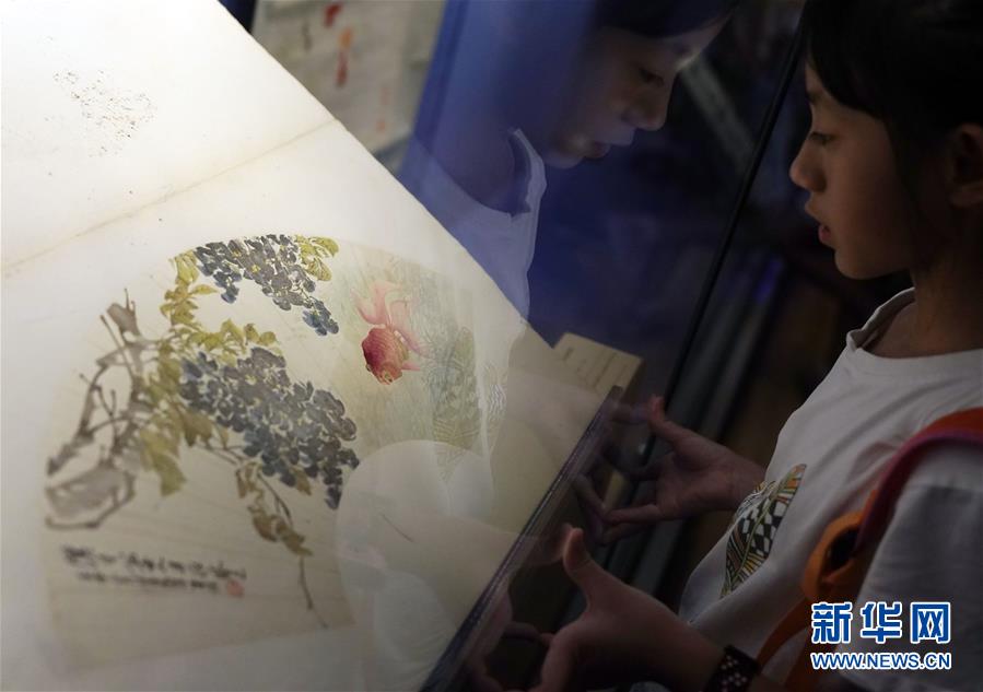 7月30日,观众参观紫藤金鱼图扇面。 当日,“观鱼知乐——宫廷金鱼文化与故宫博物院藏金鱼题材文物联展”在北京故宫延禧宫开幕。联展采用“实物+文物”的形式,分为金鱼展和金鱼题材文物展两个部分,展出来自北京、上海、福州、苏州等地的近200条宫廷金鱼和故宫博物院藏金鱼题材文物34件。 新华社记者 金良快 摄