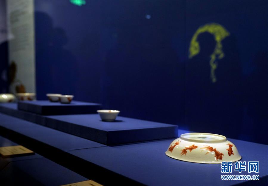 7月30日在故宫延禧宫拍摄的金鱼纹盘。 当日,“观鱼知乐——宫廷金鱼文化与故宫博物院藏金鱼题材文物联展”在北京故宫延禧宫开幕。联展采用“实物+文物”的形式,分为金鱼展和金鱼题材文物展两个部分,展出来自北京、上海、福州、苏州等地的近200条宫廷金鱼和故宫博物院藏金鱼题材文物34件。 新华社记者 金良快 摄