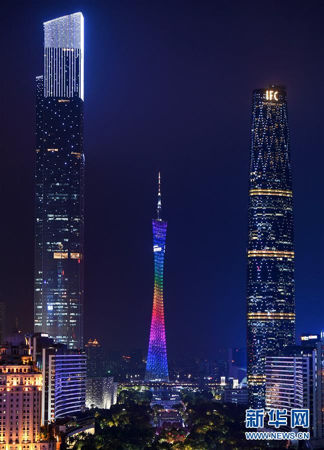 广州珠江新城夜景(2018年10月18日摄)。 新中国成立70年来,广州东进南拓,一路向海,将城市建成区推向了珠江入海口,实现了从滨江城市到滨海之都的历史性跨越。如今,广州再出发,向大湾区科创高地进军。 新华社记者 邓华 摄