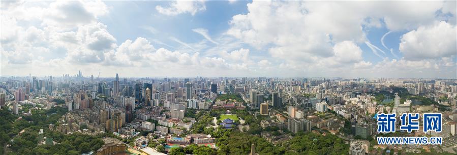 这是广州城市传统中轴线越秀山人民公园全景照片(7月26日无人机拍摄)。 新中国成立70年来,广州东进南拓,一路向海,将城市建成区推向了珠江入海口,实现了从滨江城市到滨海之都的历史性跨越。如今,广州再出发,向大湾区科创高地进军。 新华社记者 刘大伟 摄
