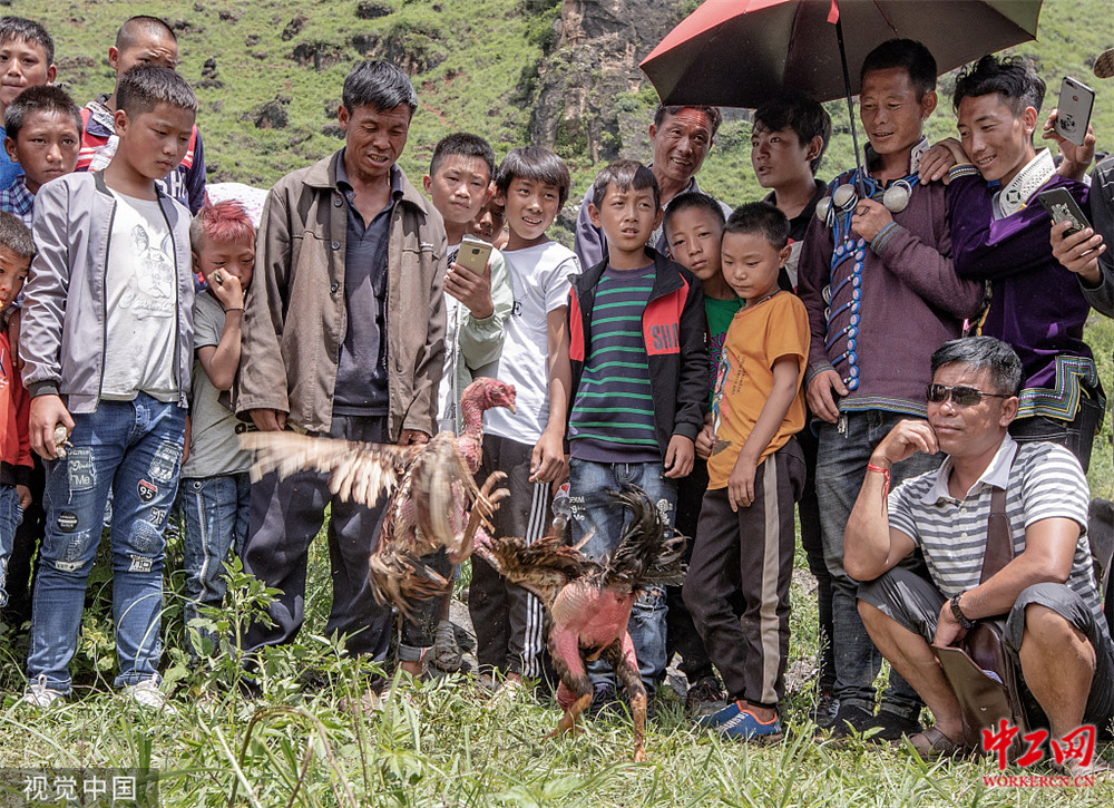 2019年7月26日,四川凉山,普格县西洛乡火把节会场上,斗鸡比赛正在紧张激烈进行。