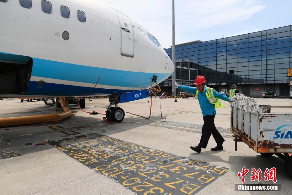 7月31日,虹桥机场行李搬运工正在抓紧时间装卸物品。近日,上海持续高温,工作在上海市虹桥和浦东两大机场停机坪上的员工冒着高温酷暑坚守岗位。中新社记者 殷立勤 摄