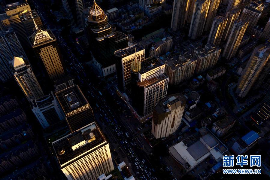 7月31日傍晚,福州霞光满天,落日余晖映照在城市的建筑物上,美不胜收(无人机拍摄)。