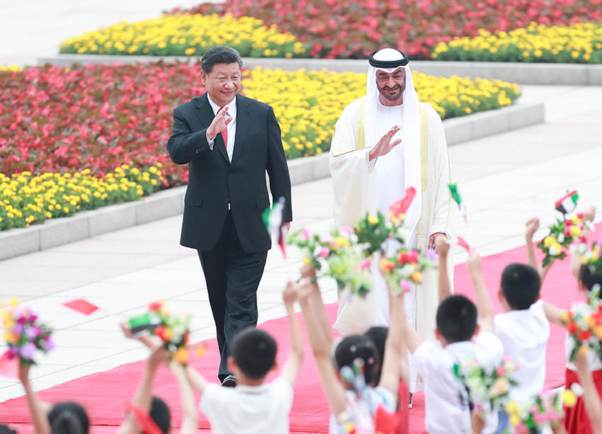 7月22日,国家主席习近平在北京人民大会堂同阿联酋阿布扎比王储穆罕默德举行会谈。这是会谈前,习近平在人民大会堂东门外广场为穆罕默德举行欢迎仪式。 新华社记者庞兴雷摄