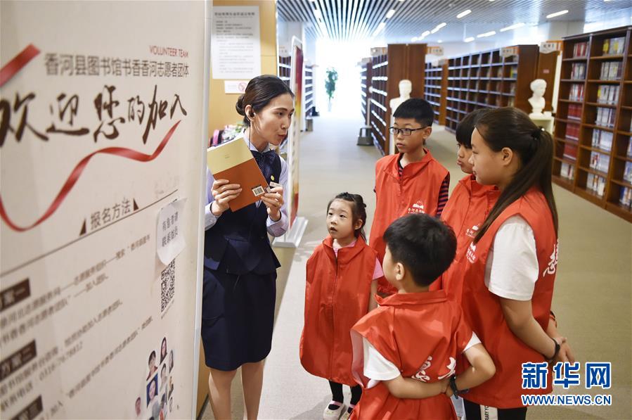 8月3日,小志愿者在香河县图书馆工作人员的指导下学习图书相关知识。新华社记者 鲁鹏 摄