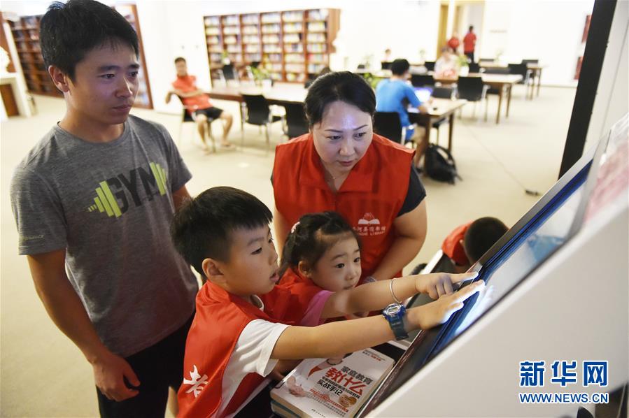 8月3日,小志愿者在香河县图书馆家长志愿者(后右)的指导下协助读者自助还书。新华社记者 鲁鹏 摄