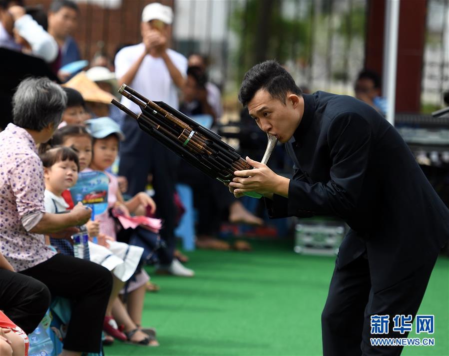 8月3日,在连城县莒溪镇莒市村,福建省歌舞剧院演员为村民表演。 当日,福建省歌舞剧院“红色文艺轻骑兵”走进闽西连城县莒溪镇莒市村,为村民带来文艺演出。 新华社记者 彭张青 摄