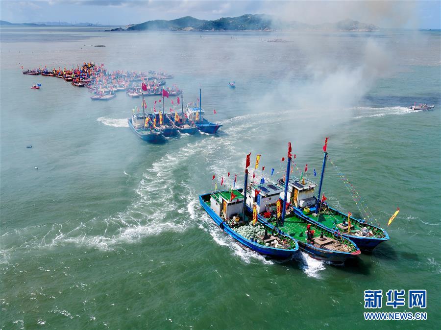 8月3日,在首届福清开渔节上,渔船驶向大海(无人机拍摄)。新华社记者 姜克红 摄