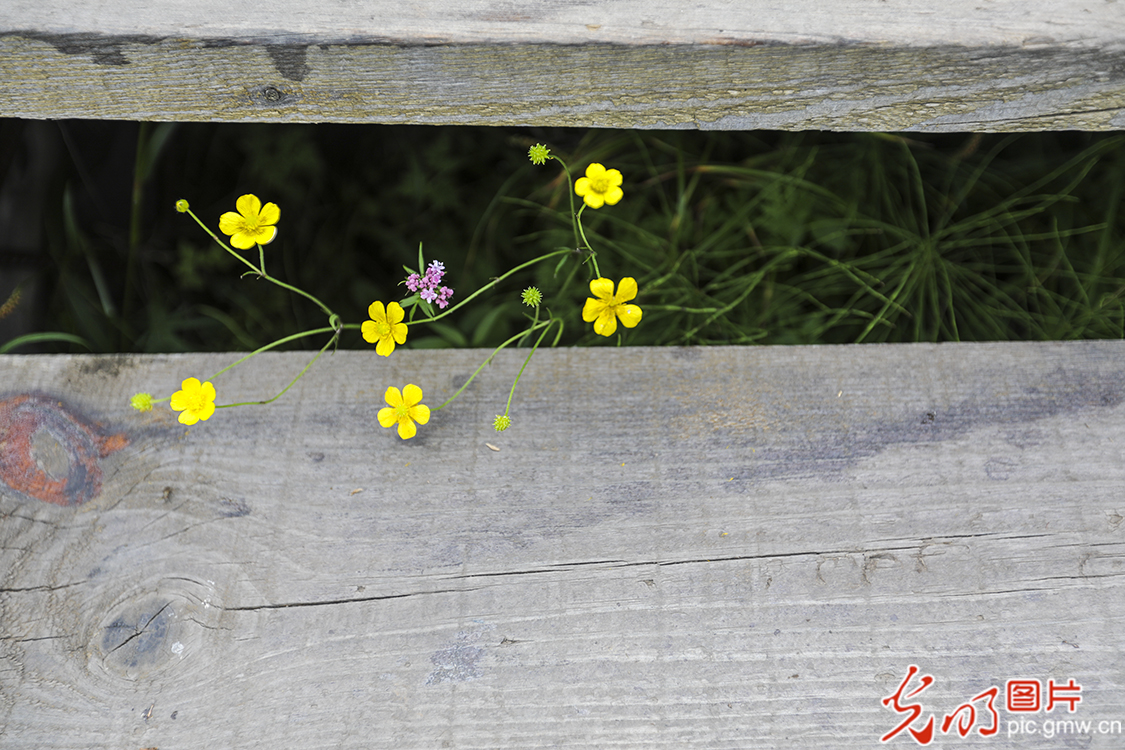 苏木山林场坐落在内蒙古兴和县大南山深处,以其险峻的山势,茂密的森林,纷呈的花卉吸引人们前来观光旅游。季夏时节,由苏木山山脚顺着栈道一路登高,满山的落叶松林遮天蔽日。登上苏木山最高点黄石崖,观远山,不同层次的绿色前呼后拥般扑向眼帘,仿佛诉说着一个个务林人造林护林的动人故事。60年风雨,两代人的不懈努力,荒山秃岭上人工种植出18.6万亩人工林如今已郁郁葱葱。图为苏木山林场木栈道上的野花。 张瑜摄/光明图片
