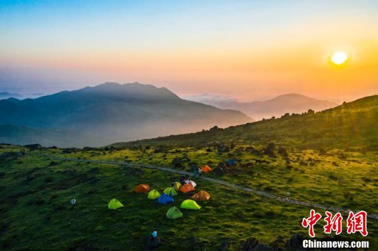 一群户外运动爱好者正在玉华山主峰观看壮美的日出景观。李福孙 摄