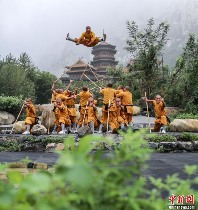 8月4日,正处三伏天气,少林寺的所在地河南登封,少林小子们在禅宗少林音乐大典冒着酷暑坚持练功。少林罗汉阵、铁布衫·三枪刺身、少林棍、少林石锁功、铁掌劈砖、击水练功、拳脚对打等,在夏日的高温中追寻少林绝学。在训练中,少林小子们辗转腾挪,石锁棍枪,各种招式轮番上阵,即使大汗淋漓,练功服湿透,也没有丝毫退怯!渴了累了,抱起水桶來番畅饮,对他们来说,“夏练三伏”不仅提高了自身的耐热能力和身体素质,更重要的是锻炼了坚韧不拔的精神意志力。图为少林震山棍,风随棍动。 中新社记者 王中举 摄
