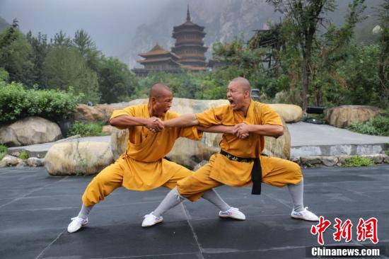 8月4日,正处三伏天气,少林寺的所在地河南登封,少林小子们在禅宗少林音乐大典冒着酷暑坚持练功。少林罗汉阵、铁布衫·三枪刺身、少林棍、少林石锁功、铁掌劈砖、击水练功、拳脚对打等,在夏日的高温中追寻少林绝学。在训练中,少林小子们辗转腾挪,石锁棍枪,各种招式轮番上阵,即使大汗淋漓,练功服湿透,也没有丝毫退怯!渴了累了,抱起水桶來番畅饮,对他们来说,“夏练三伏”不仅提高了自身的耐热能力和身体素质,更重要的是锻炼了坚韧不拔的精神意志力。图为两人对战。 中新社记者 王中举 摄