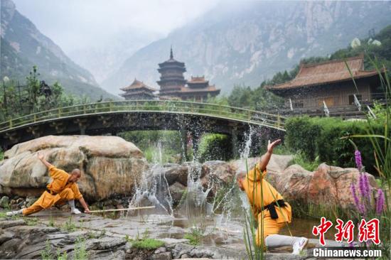 8月4日,正处三伏天气,少林寺的所在地河南登封,少林小子们在禅宗少林音乐大典冒着酷暑坚持练功。少林罗汉阵、铁布衫·三枪刺身、少林棍、少林石锁功、铁掌劈砖、击水练功、拳脚对打等,在夏日的高温中追寻少林绝学。在训练中,少林小子们辗转腾挪,石锁棍枪,各种招式轮番上阵,即使大汗淋漓,练功服湿透,也没有丝毫退怯!渴了累了,抱起水桶來番畅饮,对他们来说,“夏练三伏”不仅提高了自身的耐热能力和身体素质,更重要的是锻炼了坚韧不拔的精神意志力。图为少林石锁功。 中新社记者 王中举 摄