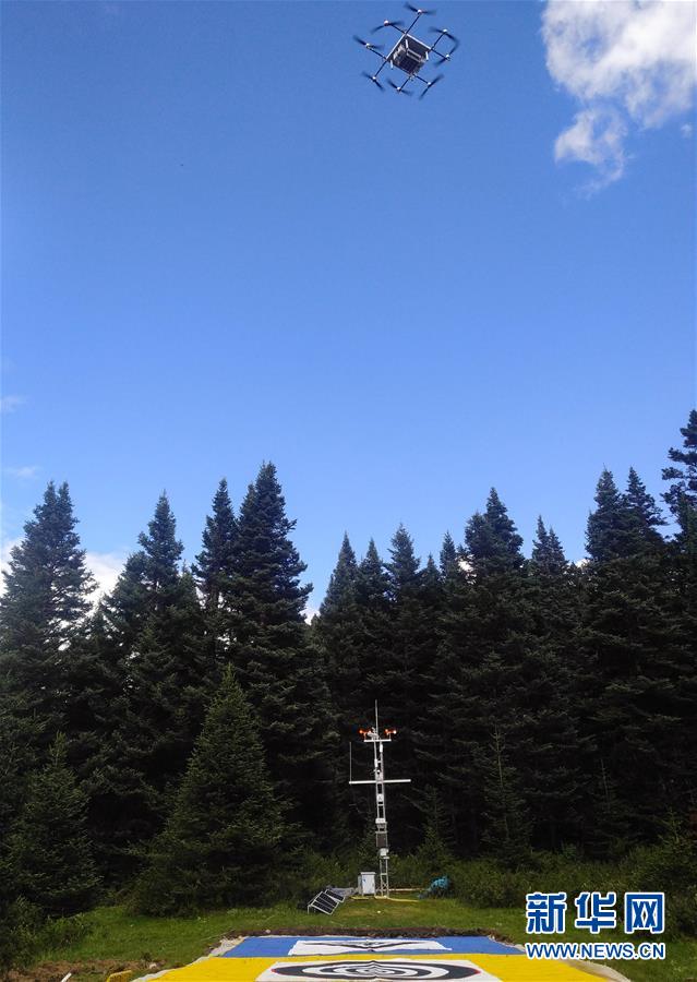 8月5日,在雅江县帕姆岭寺顺丰无人机雅江运营基地,一架无人机升空准备前往一号营地。新华社记者 江宏景 摄