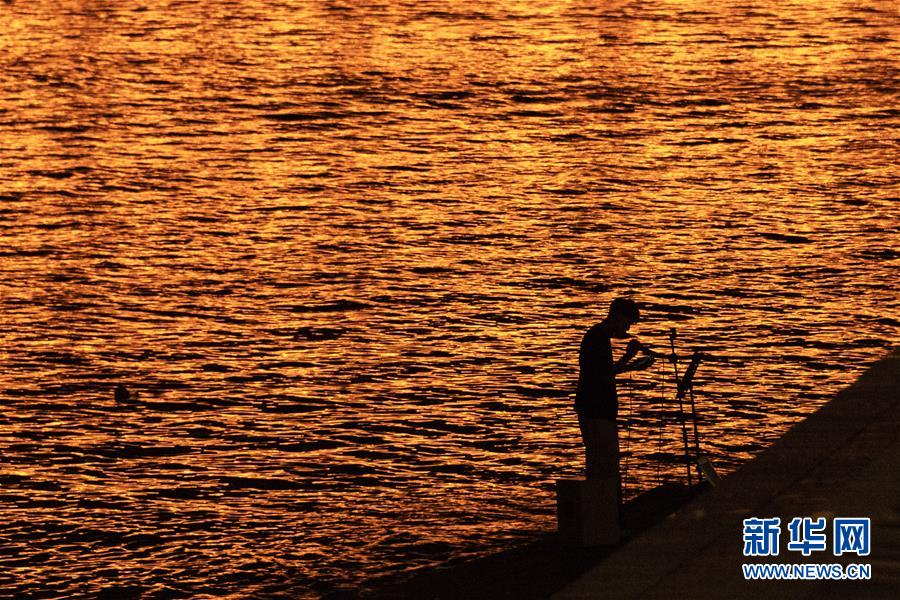 市民在落日余晖下的哈尔滨松花江畔唱歌(7月31日)。新华社发(谢剑飞摄)