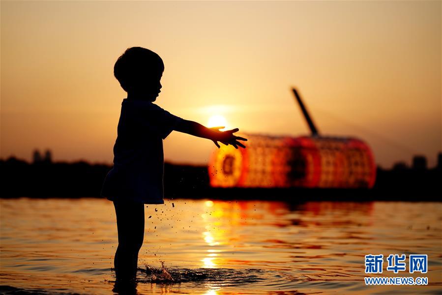 一名小朋友在哈尔滨松花江畔的夏季公益浴场玩沙子(7月30日摄)。新华社记者 王建威 摄