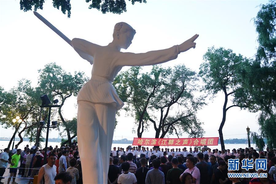 在哈尔滨松花江畔,合唱团的歌声引来游客欣赏(7月30日摄)。新华社记者 王建威 摄