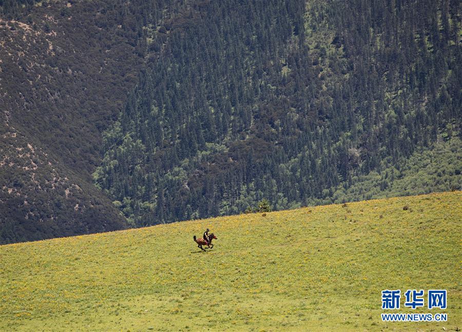 8月5日,在雅江县西俄洛镇郭岗顶,当地藏族青年昂汪扎西在草原上策马奔腾。 盛夏,四川省雅江县迎来最美季节,在蓝天白云的映衬下,森林、河流、草甸、牛羊构成一幅幅美丽的画卷,吸引众多游客前来。 新华社记者 江宏景 摄