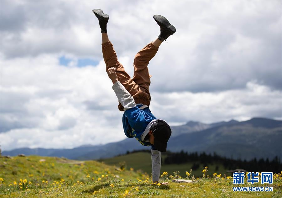 8月5日,在雅江县西俄洛镇郭岗顶,当地藏族少年格登降措在草原上玩倒立。 盛夏,四川省雅江县迎来最美季节,在蓝天白云的映衬下,森林、河流、草甸、牛羊构成一幅幅美丽的画卷,吸引众多游客前来。 新华社记者 江宏景 摄