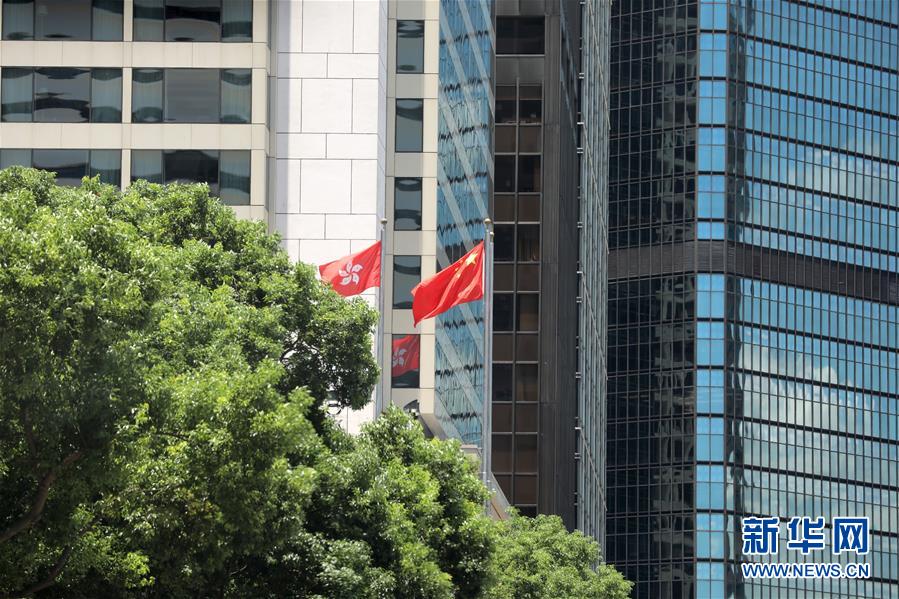 香港街头五星红旗和紫荆花旗迎风飘扬(8月5日摄)。 新华社记者 吴晓初 摄