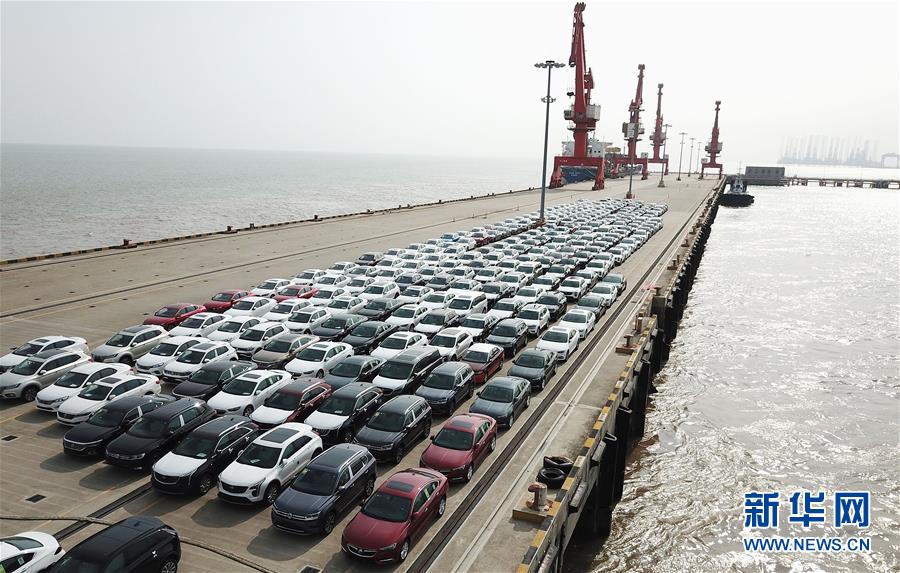 在位于上海临港的上海南港码头,新出厂的汽车等待装船转运(6月27日无人机拍摄)。 新华社记者 方喆 摄