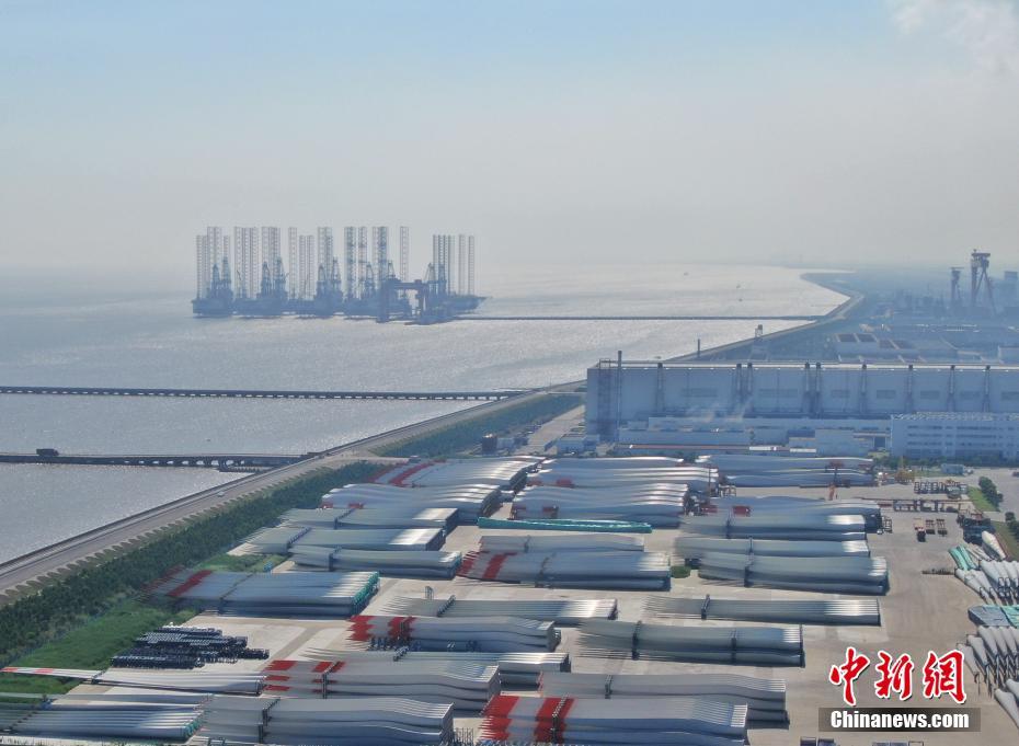图为远处眺望是中船集团在建的海上作业平台,近处是上海电气生产的风力发电叶片。中新社记者 张亨伟 摄