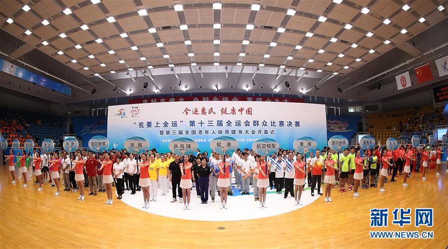 新中国成立以来,专业体育和全民健身共同发展,共同促进体育事业的日益繁荣。 2017年7月2日,“我要上全运”第十三届全运会群众比赛决赛开幕式曁第三届全国老年人体育健身大会在天津市人民体育馆举行。图为参赛代表队在开幕式上。 新华社记者曹灿摄
