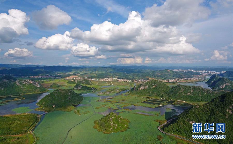 云南丘北普者黑国家湿地公园景色(8月6日无人机拍摄)。 近日,位于云南省文山壮族苗族自治州丘北县的普者黑国家湿地公园荷花盛开,草肥水美,景色秀丽。 新华社记者 杨宗友 摄