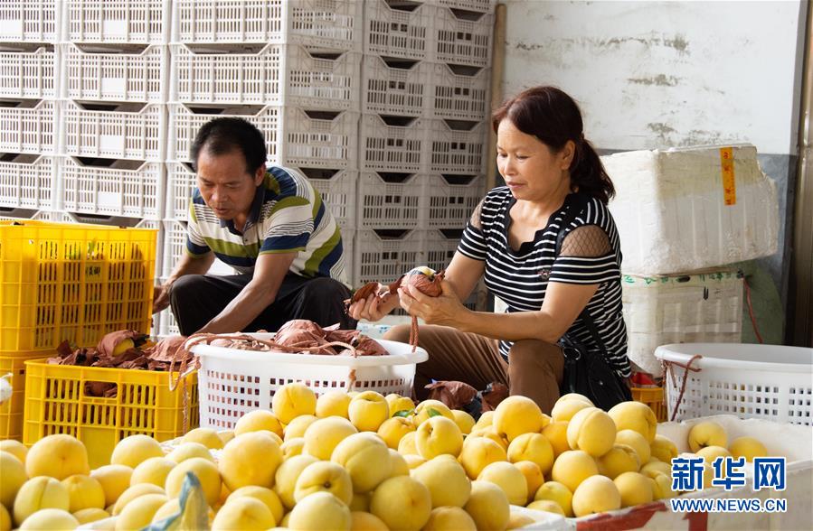 8月6日,湖南省炎陵县中村瑶族乡平乐村村民在分拣黄桃。 眼下正是湖南炎陵县黄桃的摘果季节。截至2018年,炎陵县黄桃种植面积5.1万亩,年产量2.3万吨。全县逾3万人种植黄桃,5.8万人通过各种方式参与黄桃产业链,黄桃产业成为当地百姓脱贫致富的重要支撑。2019年7月,炎陵县中村瑶族乡依靠黄桃产业入选湖南省首批10个特色农业小镇。 新华社记者 柳王敏 摄