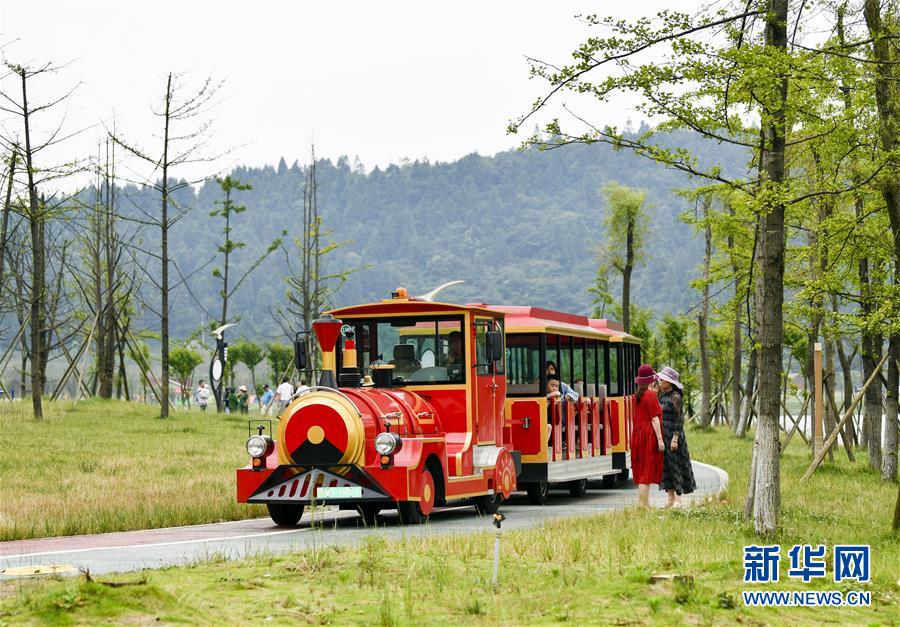 重庆丰都县南天湖景区的环湖游览道上,一辆“小火车”载着游客环湖游览(8月6日摄)。 新华社记者 刘潺 摄