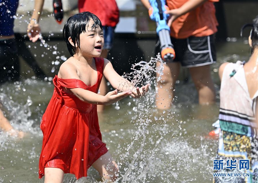 8月7日,小朋友在海南保亭七仙广场上嬉水。 当日,海南保亭的黎族、苗族群众迎来一年一度的传统节日——嬉水节。当地居民和游客互相泼水,祈求风调雨顺,幸福安康。 新华社记者 郭程 摄