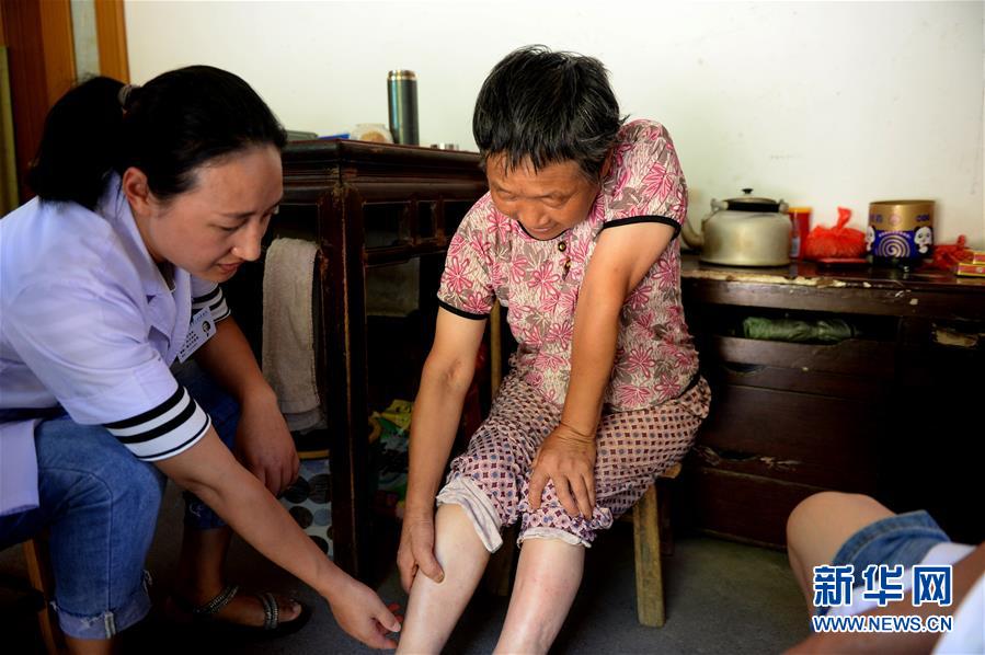8月6日,王秀艳走访贫困户金桃民家,为她检查腿部水肿。 王秀艳是安徽医科大学第二附属医院内分泌科的一名副主任医师。7月9日,她响应安徽省卫生健康委员会的号召,参与“百医驻村”专项行动,来到休宁县齐云山镇环居村成为一名村医。 环居村共691户2685人,现有建档立卡贫困户25户48人。2018年8月村里的村医退休后,村民们只能到5公里外的镇卫生院看病,来往十分不便。王秀艳的到来让停业十个多月的村卫生室重新开张,村民们在家门口就能看上病了。 驻村一个月以来,王秀艳走访了全村贫困户,帮助贫困户建立了健康档案。由于饮食习惯等因素的影响,环居村的一些村民患有高血压、糖尿病。王秀艳从事内分泌科临床工作十余年,擅长的正是这一类疾病,她希望用两年的驻村时间,为全村高血压糖尿病患者建立一个数据档案,帮助村民更有效地治疗。 新华社发(黄博涵摄)