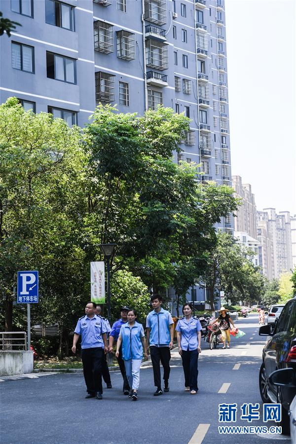 8月7日,湖州市吴兴区龙泉街道祥和片区的专职网格员和公安、行政执法、市场监管的工作人员在开展巡查走访及平安宣传。 新华社记者 徐昱 摄