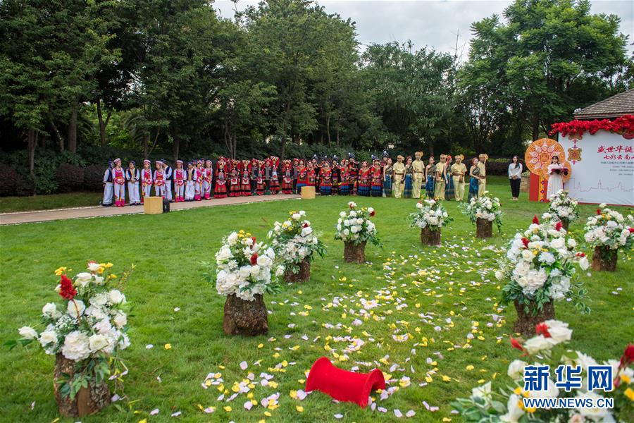 8月7日,新人们参加集体婚礼。 当日是我国传统节日七夕节,中建三局南方公司的23对职工在云南省昆明市举行集体婚礼,新人们身穿民族服饰,参与了一场别具民族风情的特色婚礼。 新华社记者 胡超 摄
