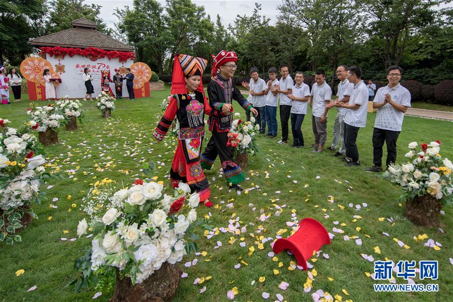 8月7日,新人参加集体婚礼。 当日是我国传统节日七夕节,中建三局南方公司的23对职工在云南省昆明市举行集体婚礼,新人们身穿民族服饰,参与了一场别具民族风情的特色婚礼。 新华社记者 胡超 摄