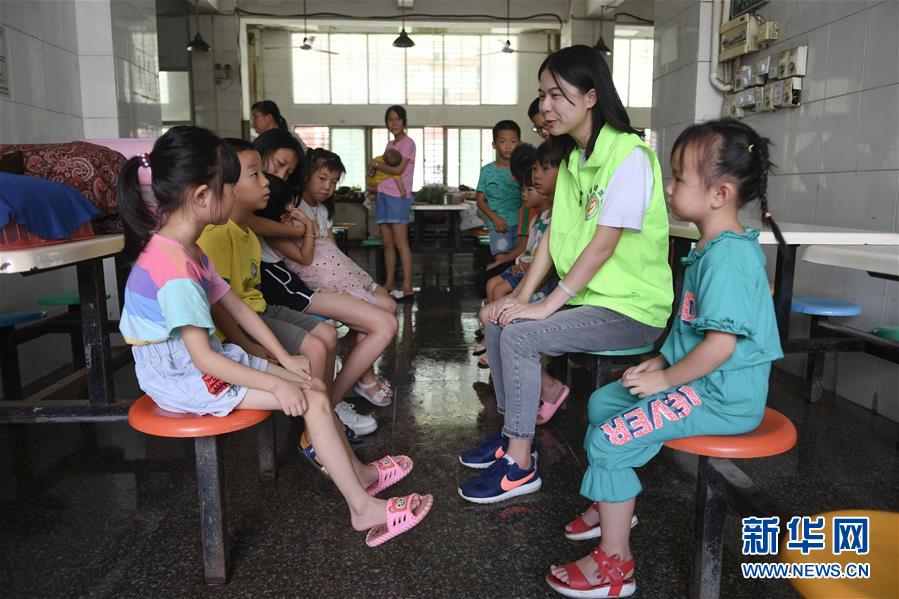 8月6日,在福建省石狮市金利莱斯服装厂食堂,石狮团市委的工作人员(右二)蔡炜炜和孩子们聊天,询问他们的年龄、爱好、特长等,为拟开展的假期大学生公益陪伴项目摸底。 新华社记者 宋为伟 摄