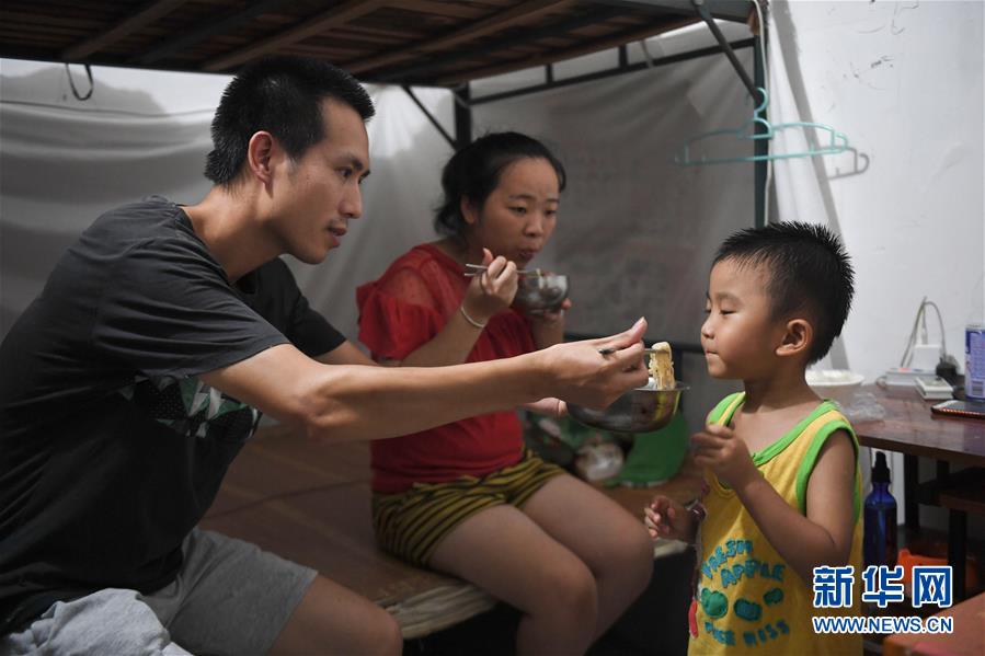 8月5日下班后,聪聪一家在宿舍吃买回来的面条。 新华社记者 宋为伟 摄