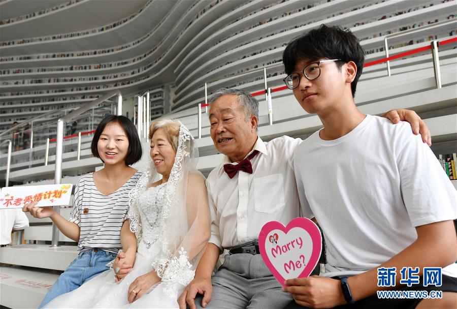 8月7日,在天津市滨海新区图书馆,一对青年情侣和一对“金婚”夫妇合影。新华社记者 李然 摄