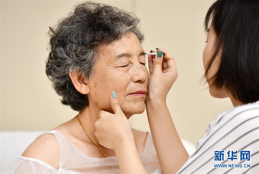 8月7日,在天津市滨海新区图书馆,志愿者为老人化妆。新华社记者 李然 摄