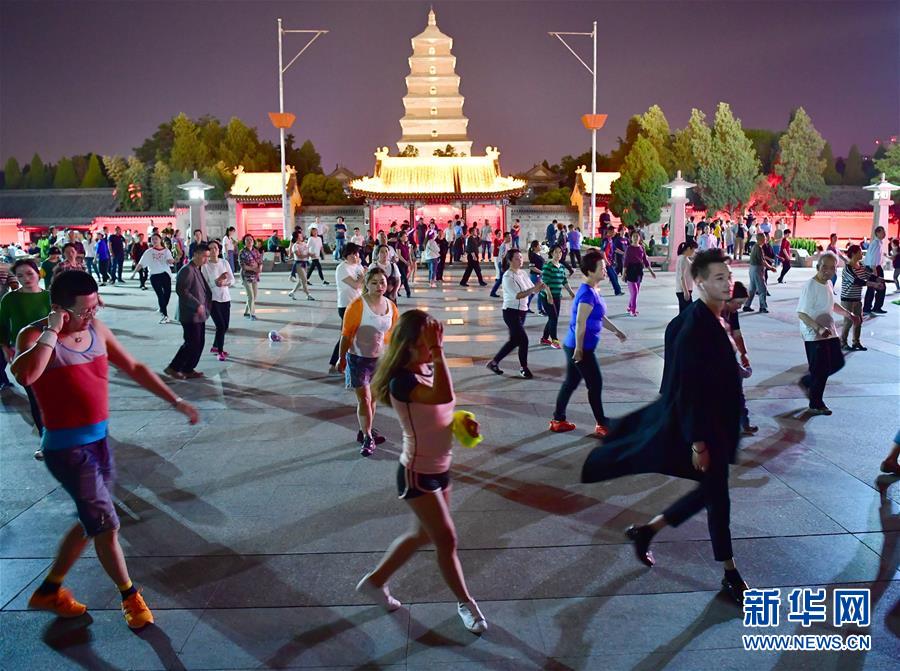 图为2018年4月19日,年轻人在西安大雁塔南广场上领舞。新华社记者邵瑞摄