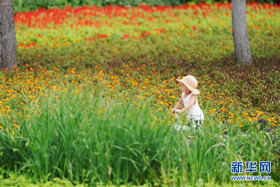 8月7日,在太阳岛风景区,小朋友在花丛中游玩。新华社记者 王建威 摄