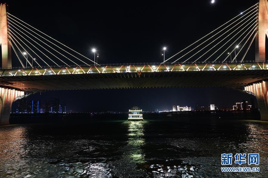 在江西南昌,游轮在赣江中行驶(8月6日摄)。 夏季,江西南昌市赣江畔高楼灯光璀璨,五光十色的灯光组成了壮观的灯光秀,吸引了大批游客。据介绍,近年来,南昌为发展“夜经济”,着力打造夜游项目,夜游项目以滕王阁为核心,借助赣江两岸景观照明,结合同步音效,打造立体、动态、富有江西元素的风景,让游客感受夜景的美丽和江西的历史文化。 新华社记者周密 摄