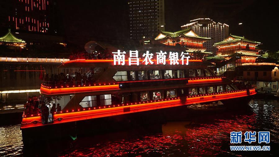 在江西南昌,游客在游轮上观赏夜景风光(8月6日摄)。 夏季,江西南昌市赣江畔高楼灯光璀璨,五光十色的灯光组成了壮观的灯光秀,吸引了大批游客。据介绍,近年来,南昌为发展“夜经济”,着力打造夜游项目,夜游项目以滕王阁为核心,借助赣江两岸景观照明,结合同步音效,打造立体、动态、富有江西元素的风景,让游客感受夜景的美丽和江西的历史文化。 新华社记者万象 摄